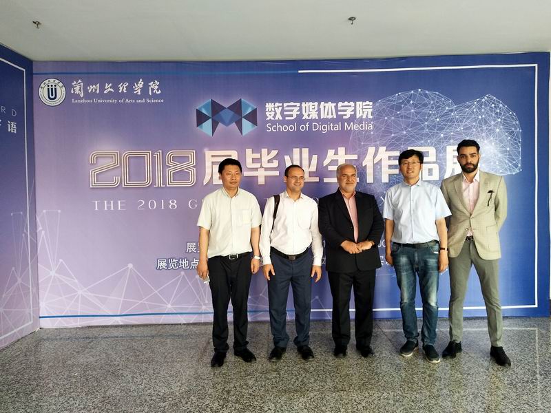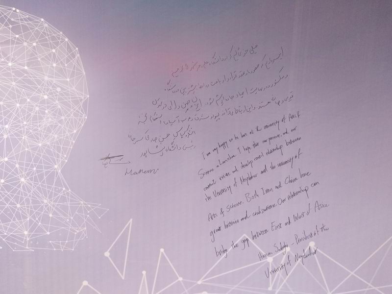 永利3044noc院长李恒杰教授首先对来访的客人介绍了学院的专业建设、实验室建设以及2018届毕业设计展的情况。并陪同观看并体验了我院2018届毕业生在虚拟现实、互动媒体、游戏动画和影视后期等四大类的部分毕业设计作品。三位伊朗来宾观看体验结束后对永利3044noc毕设作品质量给出了高度肯定与赞赏。观展期间,内沙布尔大学校长萨迪吉教授(Sadeghi)在永利3044noc毕业作品展签名墙上用波斯语寄语留念,副校长梅哈尼教授(Mehrani)用英语在签名墙上翻译。校长萨迪吉教授写道:“非常高兴能来到兰州文理学院,我希望我们的来访和合作意愿能够促成内沙布尔大学和兰州文理学院的良好关系。伊朗和中国都有着伟大的历史的文明,我们的合作关系将弥合东亚和西亚间的距离。”我校陪同领导对此表示感谢。