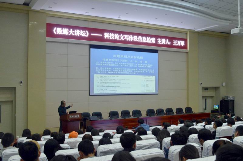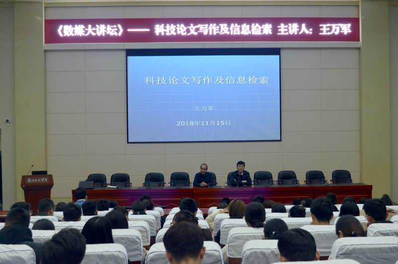 11月15日晚上19:30,为进一步提高永利3044noc毕业生论文质量,增强学生学术能力,我校永利3044noc王万军教授走进兰州文理学院《数媒大讲坛》,为永利3044noc15级本科班、16本科及专科班全体学生作了题为“科技论文写作及信息检索”的主题报告,现场200多名学生认真听取王万军教授多年论文写作及信息检索经验。报告会由永利3044noc院长李恒杰教授主持。