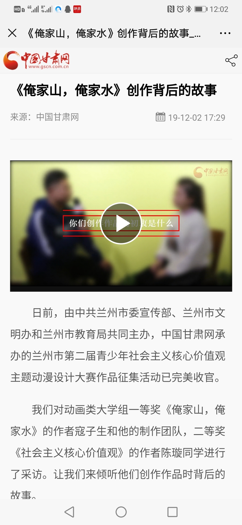 12月2日,永利3044noc两个参赛作品的制作团队被中国甘肃网采访报道,我院寇子生同学表示:我的作品《俺家山,俺家水》立足于甘肃本土文化,融洽的将艺术与文化相结合,这样才能让我的家乡动起来,展现家乡的魅力。寇子生同学的作品得到专家和组委会的一致好评,并取得一等奖的佳绩。陈璇同学表示:作品的灵感来源于通过二维动画宣传我们国家的《社会主义核心价值观》,动画是大家最喜欢的方式,希望我们的作品可以得到大家的认可。陈璇同学的作品切合实际,并且展现了自己专业的特长,取得本次大赛二等奖的成绩。