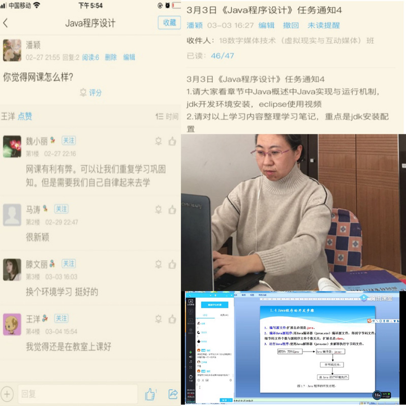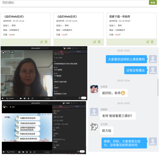 在《动态Web技术》授课中,我提前了20分钟打开直播群,让学生能在正式上课之前全部按时进群,保证上课时间和上课效率。在上直播课的过程中,我用了QQ群直播和学习通相结合的方式,学习通可以进行签到、课堂讨论及学生任务点的学习情况,并完成作业的上传与批阅,这也让我更加认识到在线教学的优势。在直播中通过小窗界面与学生互动,学生会把自己的感受和建议反馈给我,这种方式会充分调动学生的积极性,通过屏幕分享可以实现对软件的操作和课件的展示,学生按时完成任务点的学习,提交作业。学生们对直播教学反应良好,达到了学习的效果。