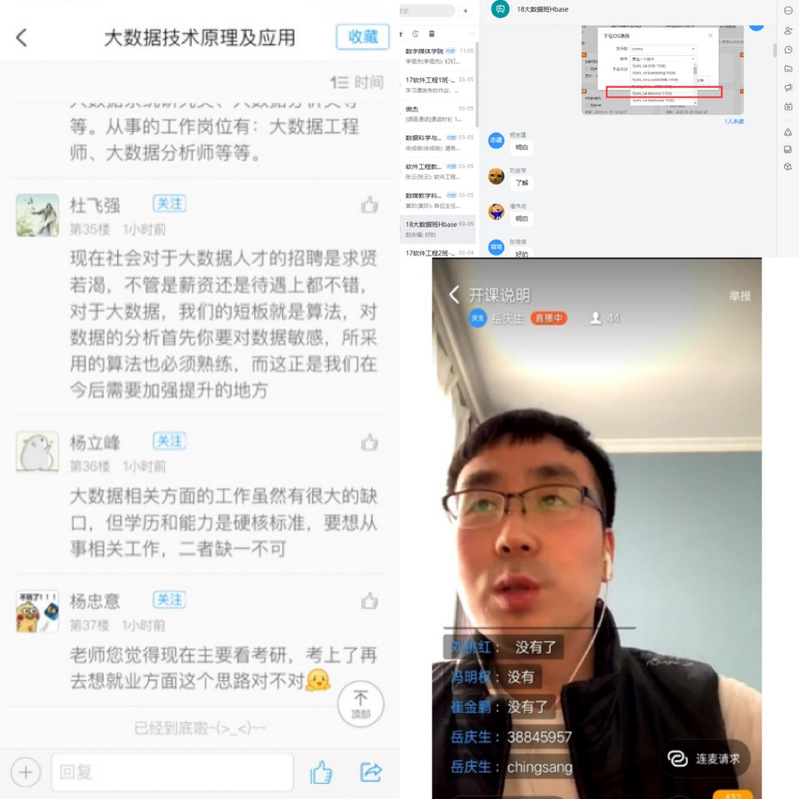 本周,我讲授的《大数据技术原理及应用》课程完成了新学期的第一次授课,我采用“慕课网+学习通+钉钉”的方式进行教学,课前会将上课内容和相关资料发送给学生,采用视频会议的形式完成了首次授课,但由于学生们未完全接受和适应这种授课方式,不愿参与互动,与学生们讨论交流的效果未达到预期。周中我将授课方式改为了直播,将自己变成“网络主播”,通过感染力较强的直播授课鼓励更多的学生融入到课堂,参与到互动中,看到“直播间”增多的评论以及学生们积极提出的问题,自豪和开心油然而生。根据上课内容,课后我会在将作业和讨论话题发布在“学习通”上,让学生们巩固线上学到的知识,还能发表自己的所感所想,增近师生的距离。