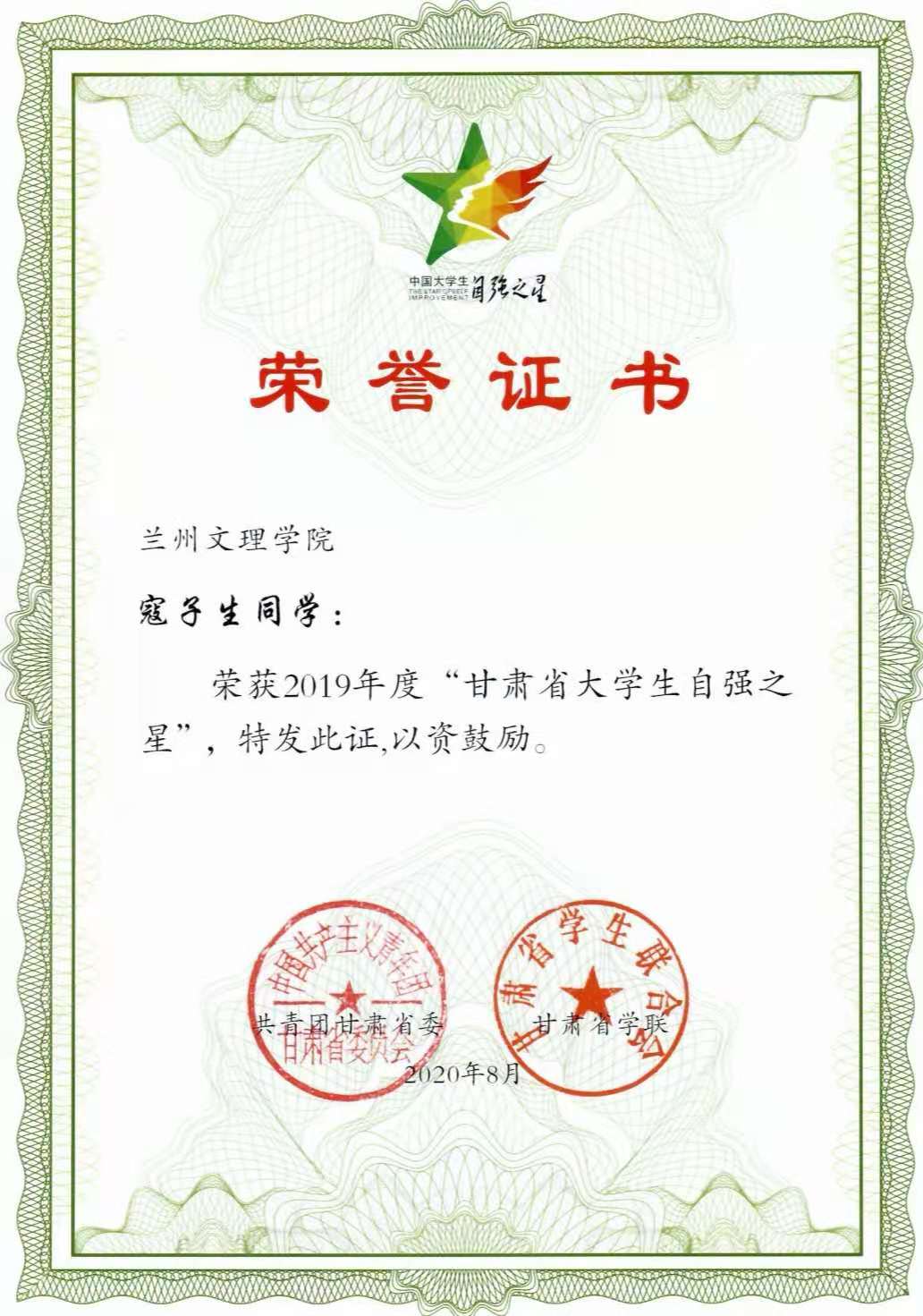 为深入贯彻习近平新时代中国特色社会主义思想,在当代大学生中树立一批可亲、可敬、可信、可学的榜样,进一步培育和践行社会主义核心价值观,按照共青团中央、全国学联通知安排,团省委、省学联组织开展了“大学生自强之星”寻访活动。经高校团组织推荐,团省委学校部、省学联秘书处会同相关部门评审,永利3044noc寇子生同学荣获2019年度“甘肃省大学生自强之星”。